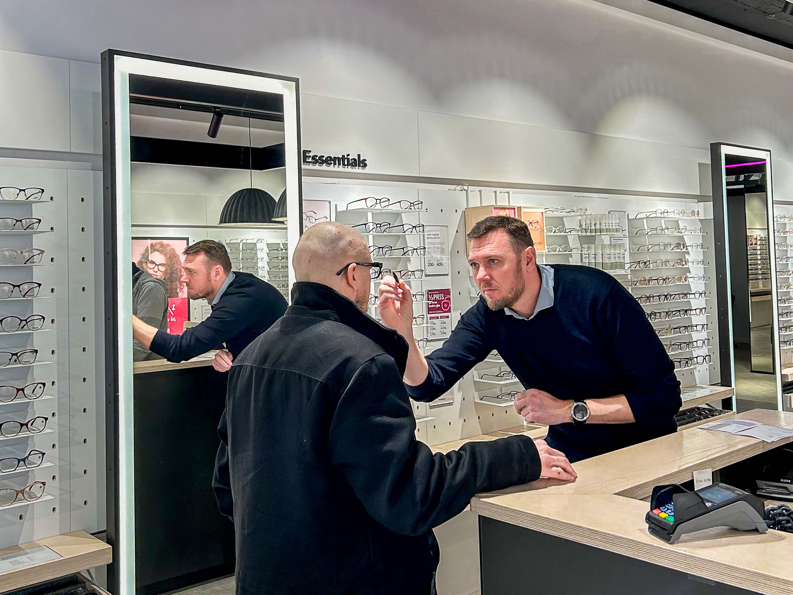 Efter et par timer i butikken er folk ved at få den sidste runde forbi de mange brillestativer inden turen går hjem. Foran det oplyste spejl kaster man lige et sidste blik på sig selv i alle vinkler.